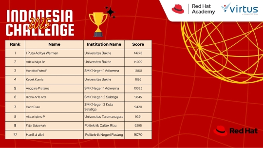 Kompetisi yang diselenggarakan oleh Red Hat Academy bekerja sama dengan Virtus Teknologi Indonesia ini merupakan salah satu program pengembangan talenta digital yang menantang peserta untuk memecahkan persoalan teknis berbasis teknologi open-source. Peserta diuji pada aspek ketepatan solusi, kemampuan analisis, serta pemahaman mendalam terhadap platform dan ekosistem Red Hat.
