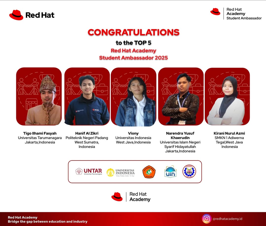 Program Red Hat Academy Student Ambassador merupakan inisiatif dari Red Hat Academy yang bertujuan untuk menjaring mahasiswa terpilih sebagai perwakilan komunitas akademik dalam mengembangkan, mempromosikan, dan memperluas pemanfaatan teknologi open-source di lingkungan kampus. Peran ini menuntut pemahaman teknis yang kuat, kemampuan komunikasi yang baik, serta komitmen dalam mendukung ekosistem pembelajaran berbasis open-source.